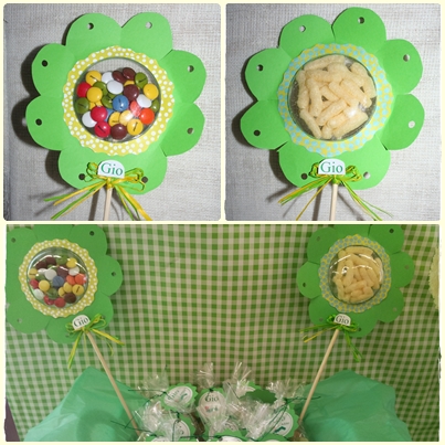 Como parte de la decoración se realizaron unas flores que dentro contenían lacasitos y gusanitos. Son monísímas y este formato se puede utilizar para adecuarlo a multitud de opciones..