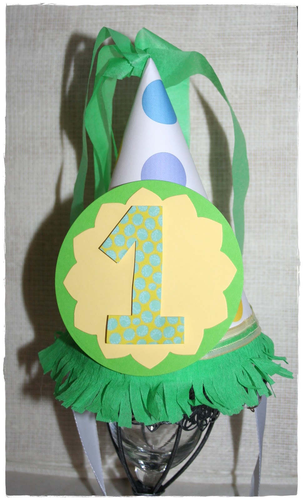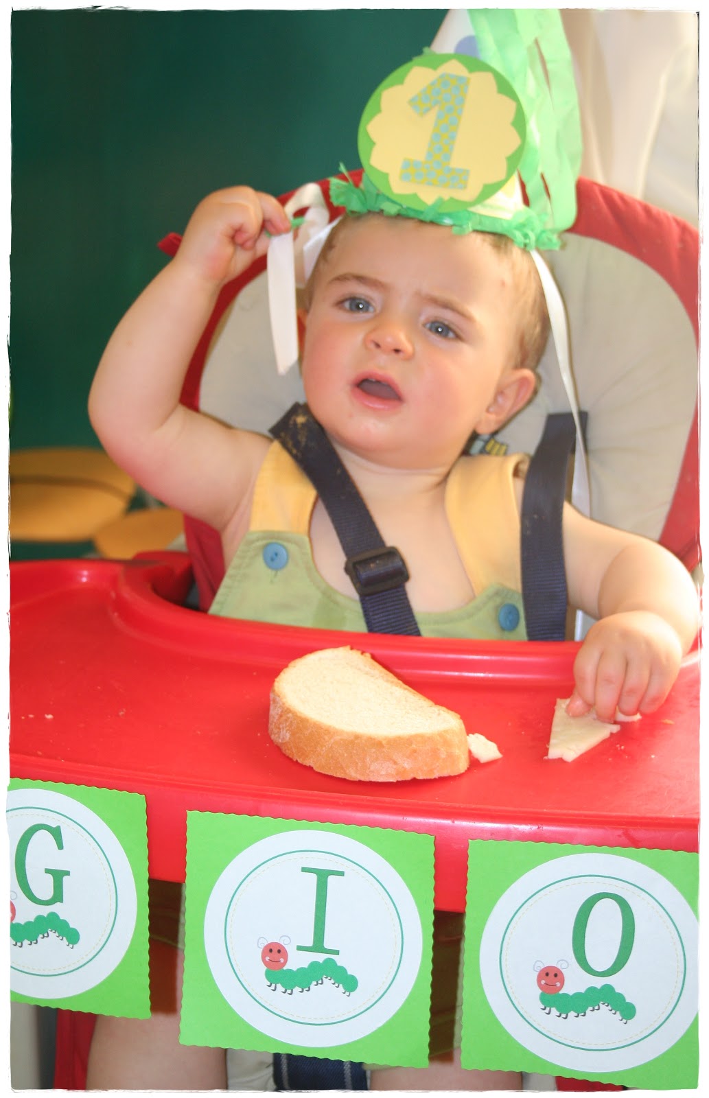 Para el rey de la fiesta decoramos un poco su trona con un cartelito con su nombre y globos y le hicimos un gorrito con el número 1. Estaba tan mono….