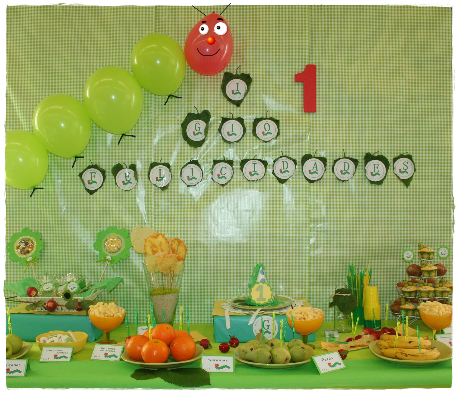 Mención especial se merece la guirnalda que en este caso para ir más acorde con la decoración y el tema se optó por poner de fondo unas hojas de morera y encima las letras que conformarían el cartel “Felicidades Gio 1”