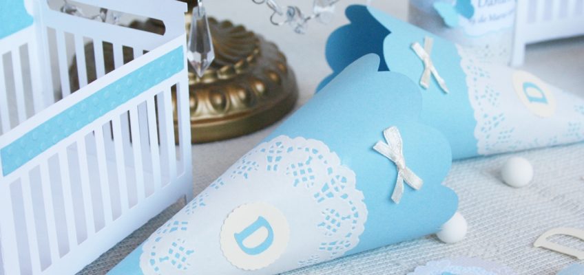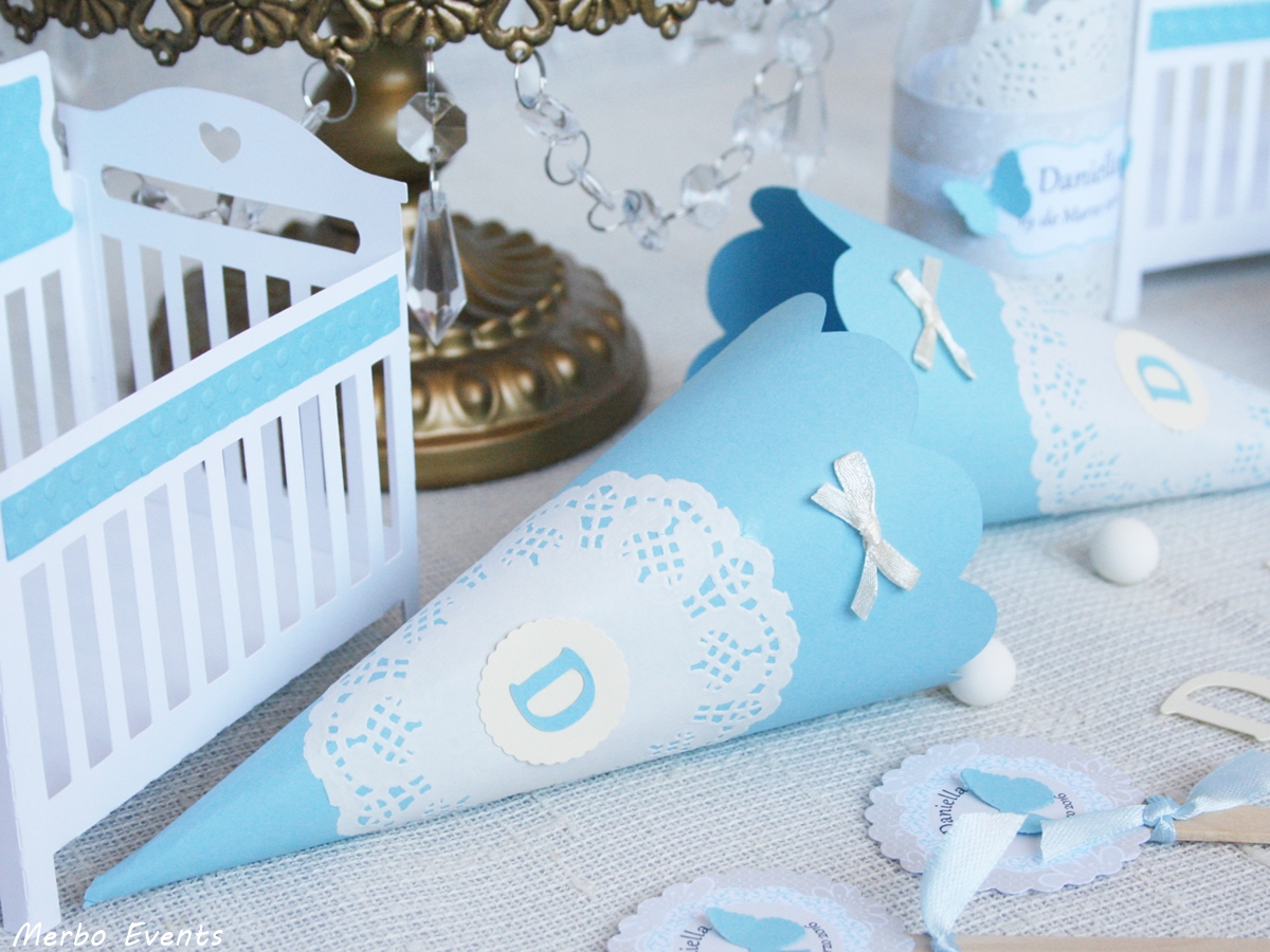 Fajines para botellitas, conos personalizados con la inicial de Daniella y cunitas para poner dentro pequeños detalles dulces.