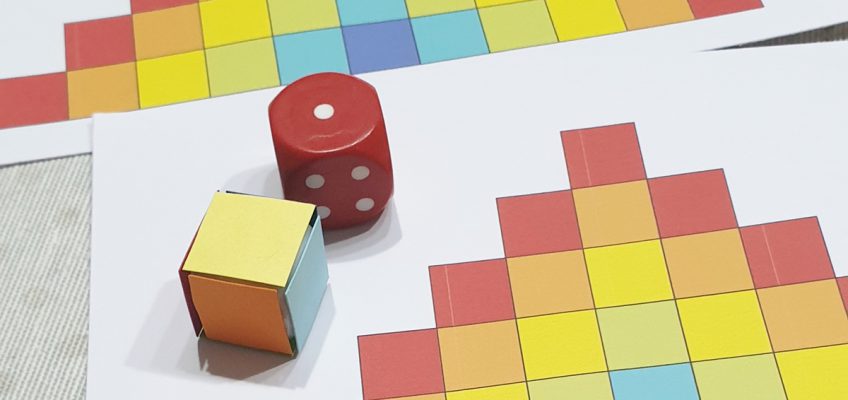 Se tiran los dos dados y se marca lo que indiquen los dados. En nuestro ejemplo, 3 amarillo: marcamos 3 cuadraditos amarillos…