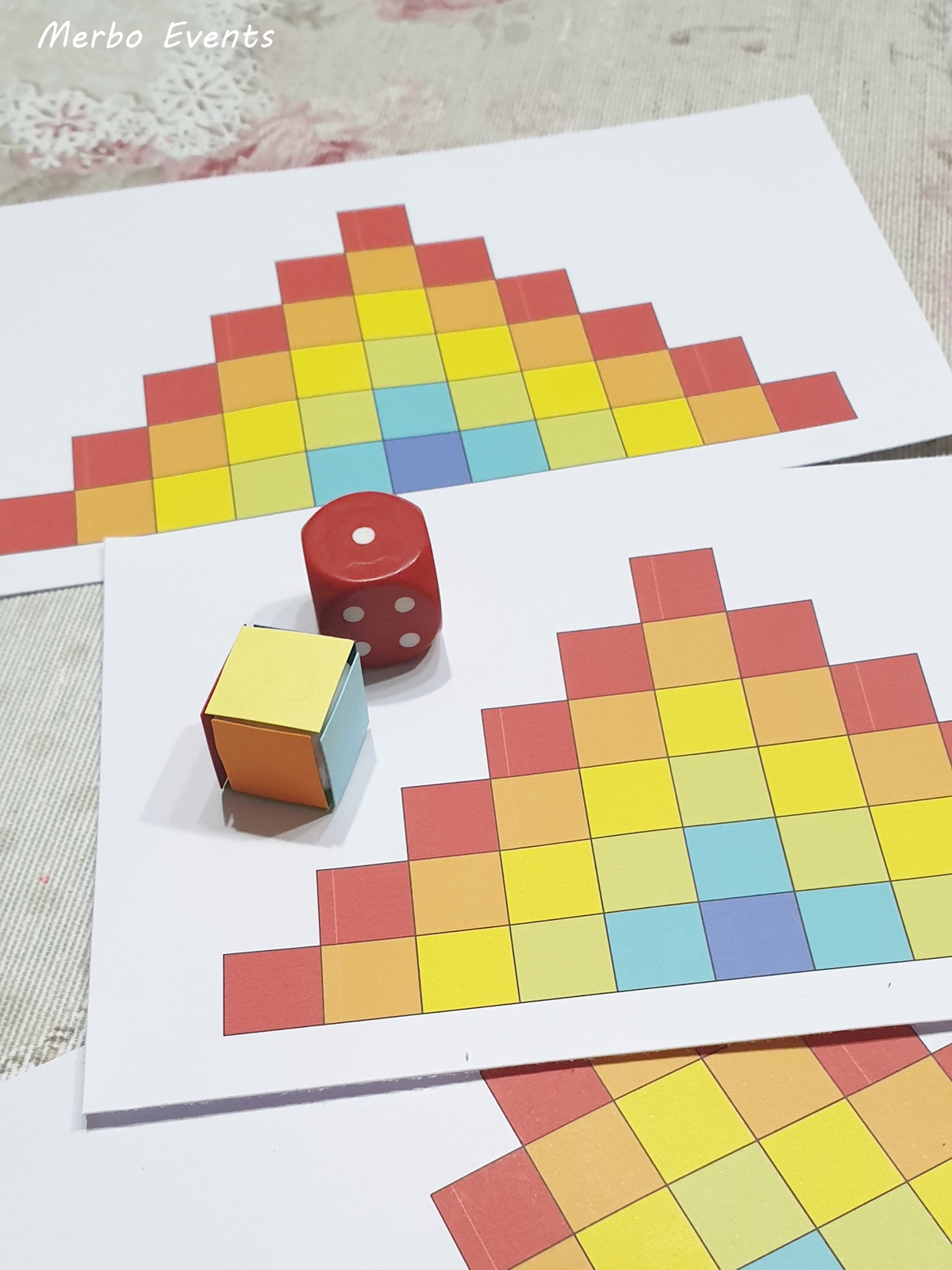 – Dado «tuneado» ( Tenéis que cortar unos trocitos de papel o cartulina y pegarlos al dado por cada cara. Han de ser del color de nuestro arcoiris. Bien hojas en blanco pintadas o cartulinas de colores… Rojo, azul cielo, azul marino, verde , naranja y amarillo)