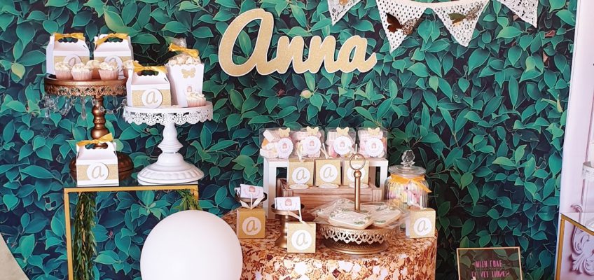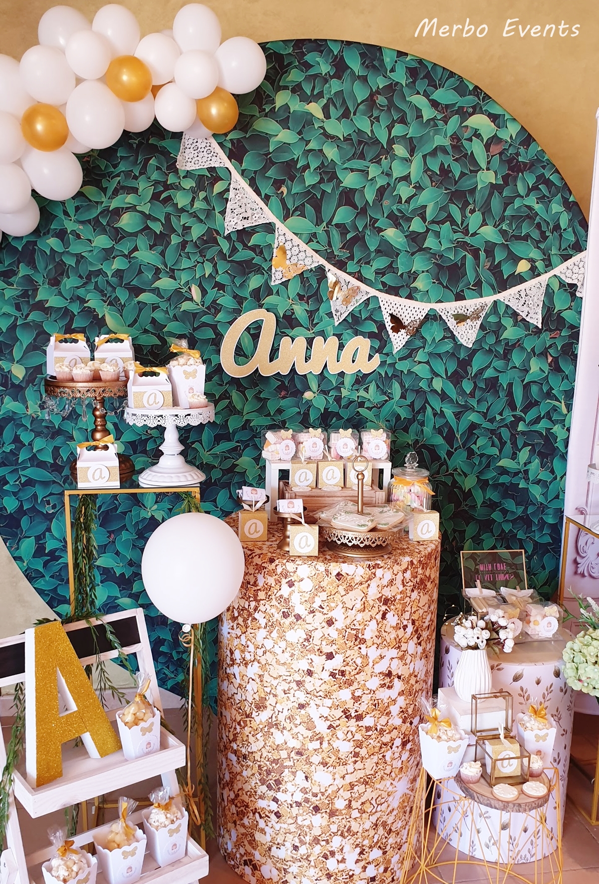 Damos la bienvenida a la bonita comunión de Anna. Decorada en tonos dorados con toques florales.Para ella y sus invitados, decoramos todo el salón, vistiendo mesas, sillas.. Montamos un rincón dulce con un photocall a juego que quedó ideal.Empezamos mostrando el rincón dulce.