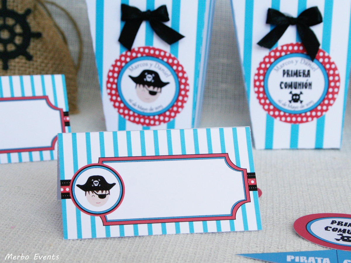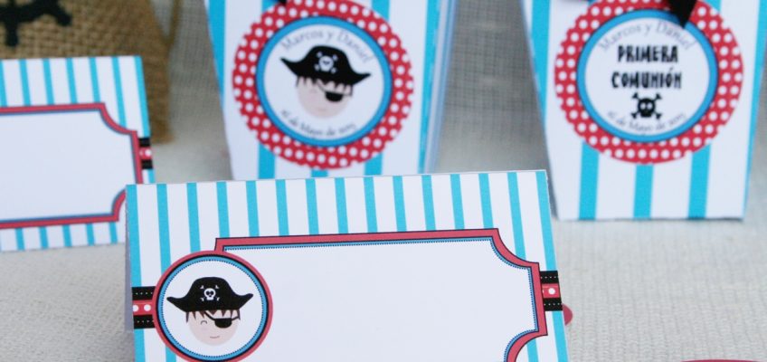 En la anterior entrada os enseñábamos los dos modelos de invitaciones que preparamos para esta Comunión pirata y hoy os traemos los detalles de la papelería que decoró la mesa de dulces, los detallitos para los invitados y la decoración de los centros de mesa.