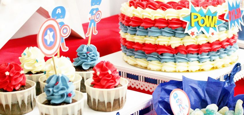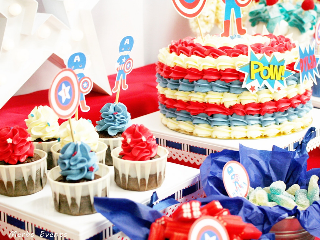 Todo siguiendo la linea de las tonalidades roja, azul y blanca y la imagen del Capitán américa y su inseparable escudo.