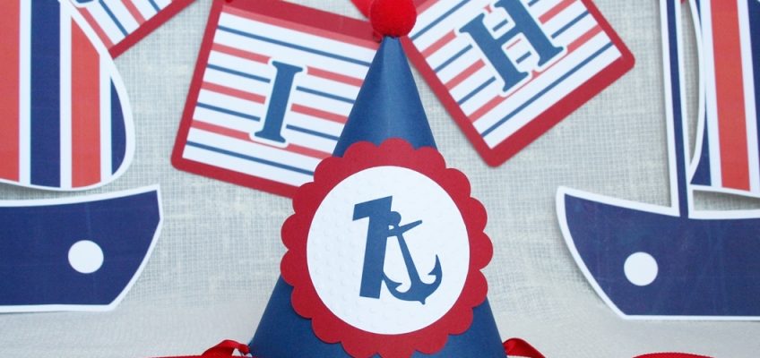 Un bonito gorrito par hacer la foto de recuerdo con el número 1 y un ancla y diferentes brochetas de barquitos para decorar los elementos de la mesa.