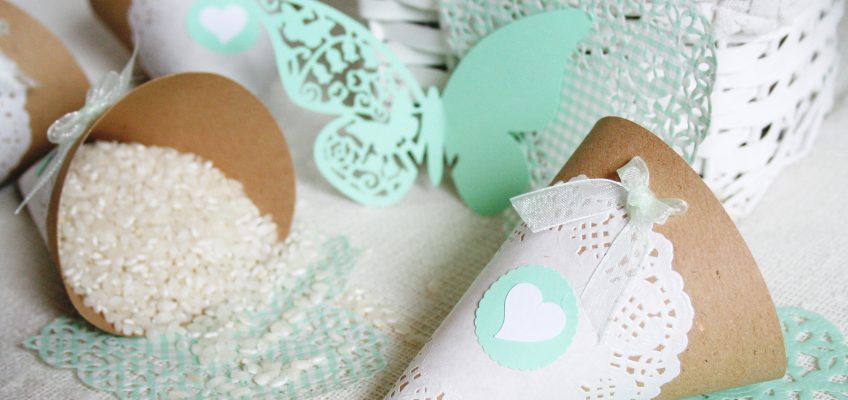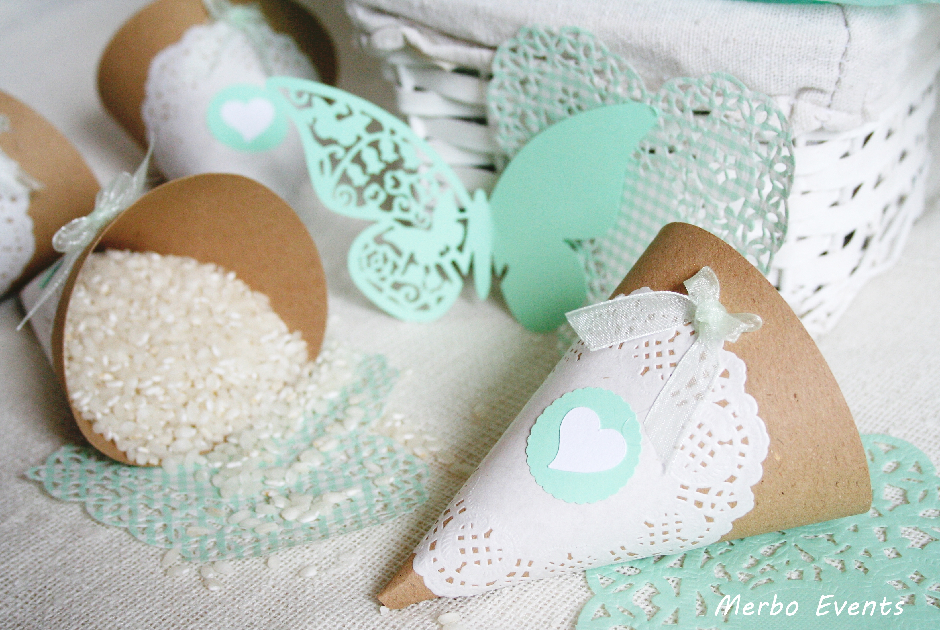 Empezamos preparando unos preciosos conitos, que esperarían a los invitados en la puerta de la iglesia.. Dentro pétalos y arroz.