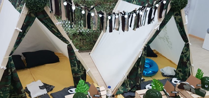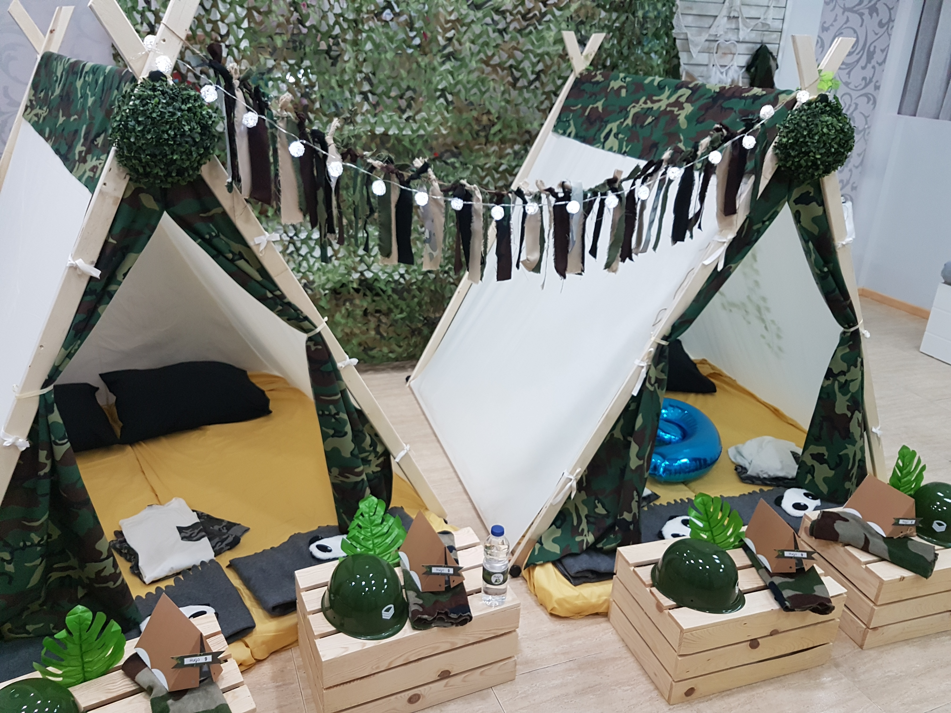 Siguiendo nuestra linea, no podíamos descuidar ningún detalle.. y cada peque tenia su mesita con un casco, la botellita de agua ( por si la aventura les daba sed por la noche) una cajita en forma de tienda llena de chuches ( para reponer fuerzas durante la noche..) y varios accesorios más que veréis en las siguientes fotos..