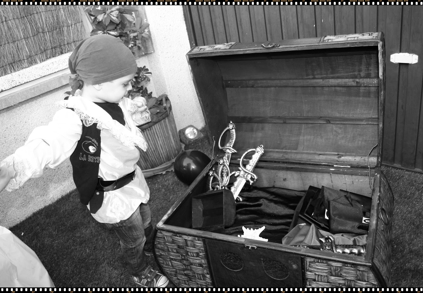 Junto al barco pusimos “el Rincón de los Complementos”. Aquí colocamos un baúl “pirata” que tenía dentro complementos para que todos los niños se convirtieran en auténticos piratas!! Pañuelo rojo o negro con calavera, parche pirata y espada.