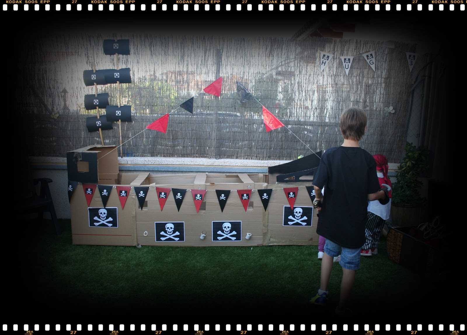Después nos centramos en buscar elementos decorativos para que el jardín se convirtiera en un auténtico escenario pirata; para ello no podía faltar “un barco pirata” realizado en cartón que posteriormente sería la sensación de la fiesta, ya que todos los peques se querían meter en él y gritar aquello de: “Al abordaje mis piratas!!”