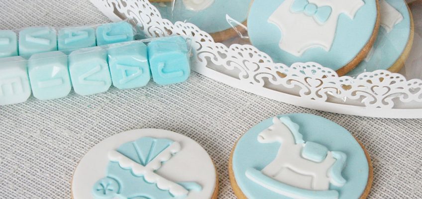 Siguiendo la misma linea de colores también preparamos unas tiernas galletitas con motivos de bebé: carrito, body,biberón, caballito..