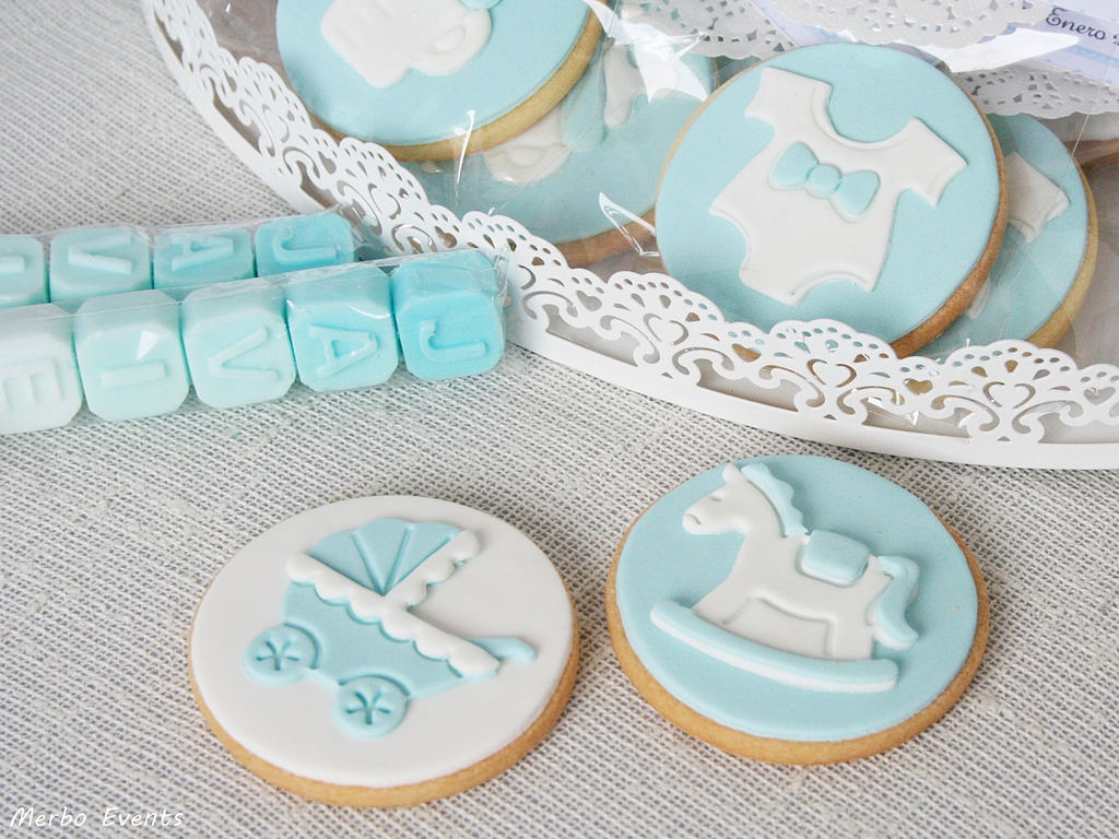 Siguiendo la misma linea de colores también preparamos unas tiernas galletitas con motivos de bebé: carrito, body,biberón, caballito..
