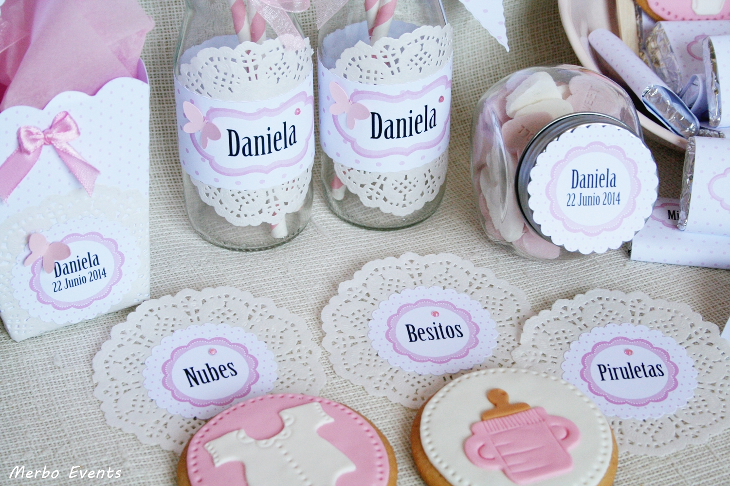 También nos encargamos de enviarle minichocolatinas personalizadas,delicadas etiquetas para decorar los jarrones donde pusieron los dulces del candy bar y galletitas que irían a juego con la temática de las mesas; baberos, biberones, bodys…