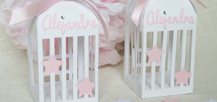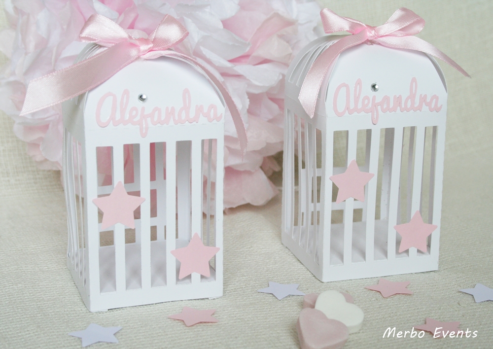Jaulitas personalizadas con el nombre de la princesa, que sirvieron para decorar un rincón de la mesa dulce.